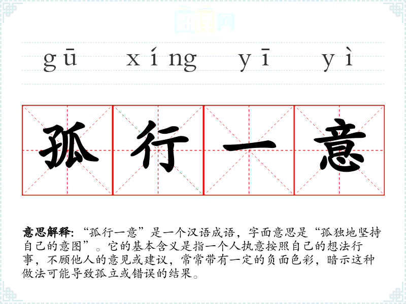 该成语的来源并不十分明确,但其组成部分可以追溯到古代文献中。成语中“孤行”一词可能源自古代对“孤独”或“孤立”的描述,而“一意”则强调了单一的意图或决心。整体来看,这个成语可能是对个人意志的一种批判,反映了对不听劝告、不顾他人感受的行为的否定。