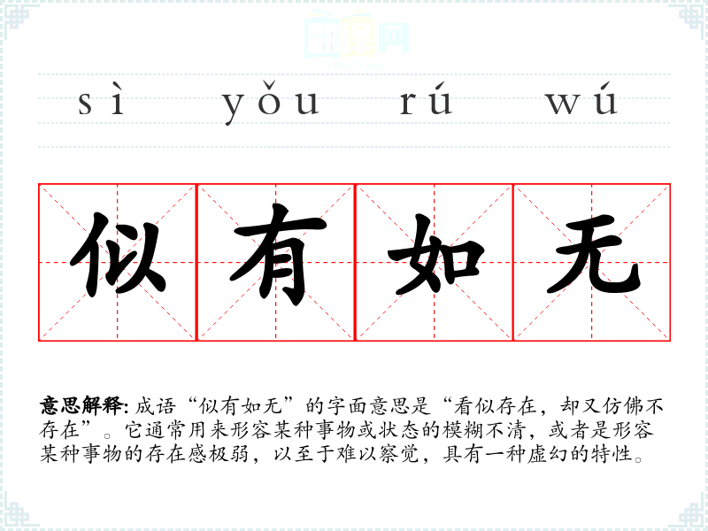 成语“似有如无”的字面意思是“看似存在,却又仿佛不存在”。它通常用来形容某种事物或状态的模糊不清,或者是形容某种事物的存在感极弱,以至于难以察觉,具有一种虚幻的特性。