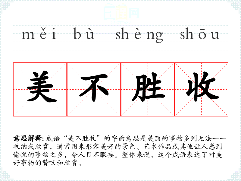 成语“美不胜收”的字面意思是美丽的事物多到无法一一收纳或欣赏,通常用来形容美好的景色、艺术作品或其他让人感到愉悦的事物之多,令人目不暇接。整体来说,这个成语表达了对美好事物的赞叹和欣赏。