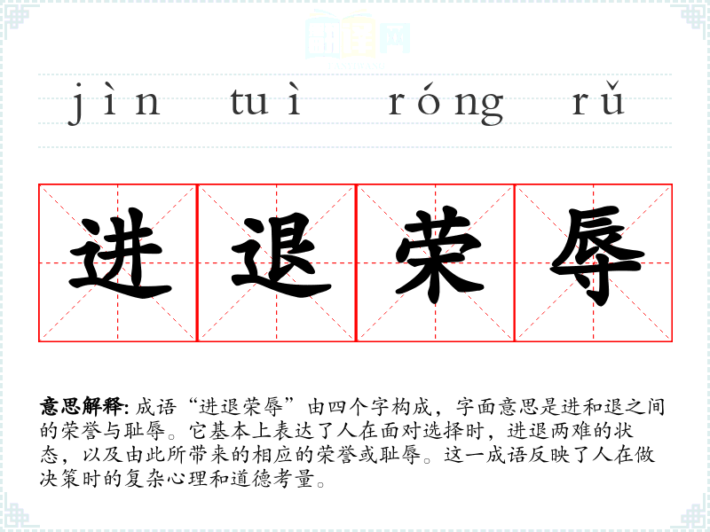 成语“进退荣辱”由四个字构成,字面意思是进和退之间的荣誉与耻辱。它基本上表达了人在面对选择时,进退两难的状态,以及由此所带来的相应的荣誉或耻辱。这一成语反映了人在做决策时的复杂心理和道德考量。