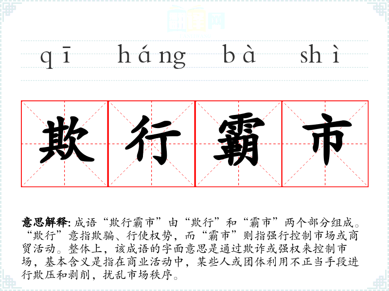 成语“欺行霸市”由“欺行”和“霸市”两个部分组成。“欺行”意指欺骗、行使权势,而“霸市”则指强行控制市场或商贸活动。整体上,该成语的字面意思是通过欺诈或强权来控制市场,基本含义是指在商业活动中,某些人或团体利用不正当手段进行欺压和剥削,扰乱市场秩序。