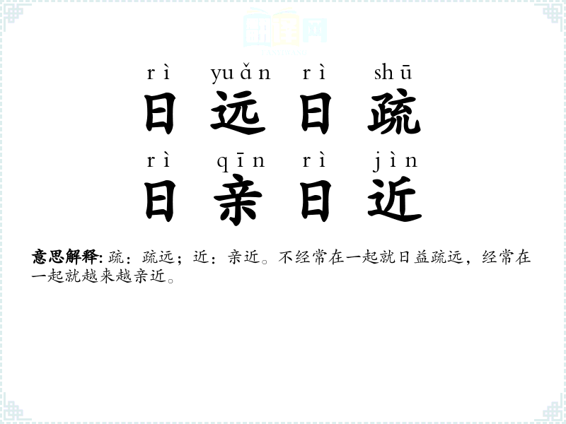 疏:疏远;近:亲近。不经常在一起就日益疏远,经常在一起就越来越亲近。 |