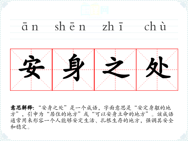 “安身之处”是一个成语,字面意思是“安定身躯的地方”,引申为“居住的地方”或“可以安身立命的地方”。该成语通常用来形容一个人能够安定生活、扎根生存的地方,强调其安全和稳定。
