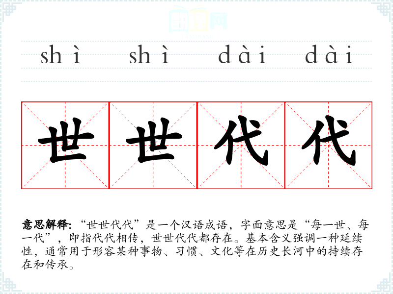 “世世代代”是一个汉语成语,字面意思是“每一世、每一代”,即指代代相传,世世代代都存在。基本含义强调一种延续性,通常用于形容某种事物、*惯、文化等在历史长河中的持续存在和传承。