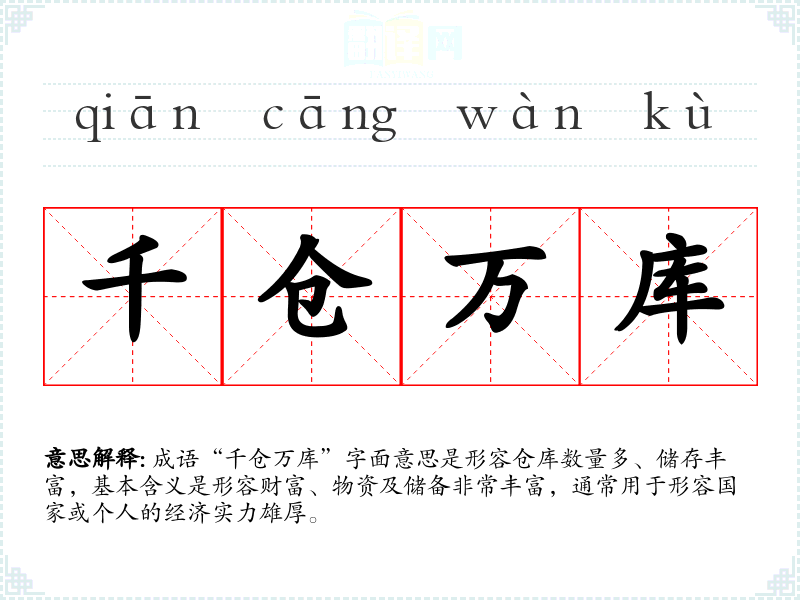 成语“千仓万库”字面意思是形容仓库数量多、储存丰富,基本含义是形容财富、物资及储备非常丰富,通常用于形容国家或个人的经济实力雄厚。