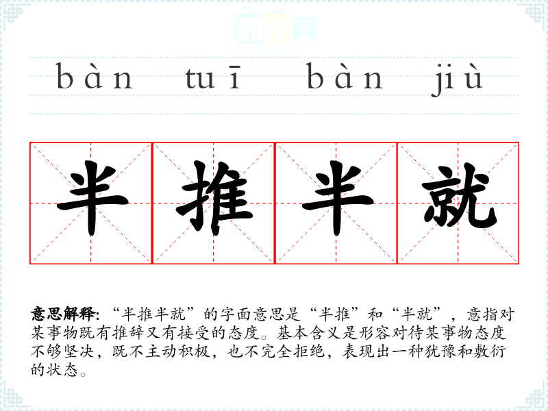 “半推半就”的字面意思是“半推”和“半就”,意指对某事物既有推辞又有接受的态度。基本含义是形容对待某事物态度不够坚决,既不主动积极,也不完全拒绝,表现出一种犹豫和敷衍的状态。