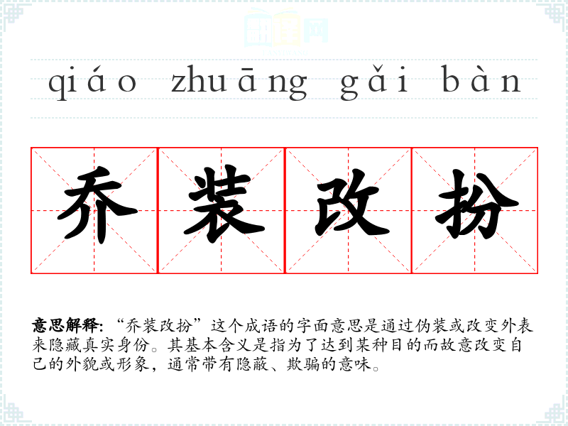 “乔装改扮”这个成语的字面意思是通过伪装或改变外表来隐藏真实身份。其基本含义是指为了达到某种目的而故意改变自己的外貌或形象,通常带有隐蔽、欺骗的意味。
