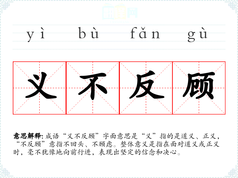 成语“义不反顾”字面意思是“义”指的是道义、正义,“不反顾”意指不回头、不顾虑。整体意义是指在面对道义或正义时,毫不犹豫地向前行进,表现出坚定的信念和决心。