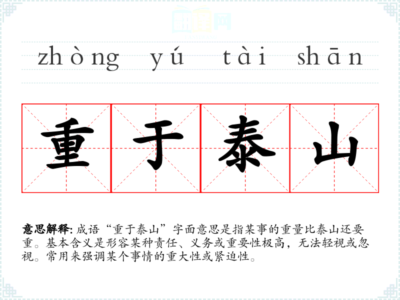 成语“重于泰山”字面意思是指某事的重量比泰山还要重。基本含义是形容某种责任、义务或重要性极高,无法轻视或忽视。常用来强调某个事情的重大性或紧迫性。