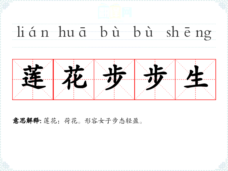 | 步步莲花 | 原形容女子步态轻盈。后常比喻渐入佳境。 |