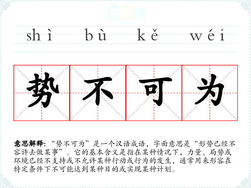 在英语中,“势不可为”可以与“beyond one's control”相对应,表达在特定情境下无法改变的状态。然而,汉语成语更强调局势对个体行动的影响,而英语表达则更侧重于个体能力的局限性。
