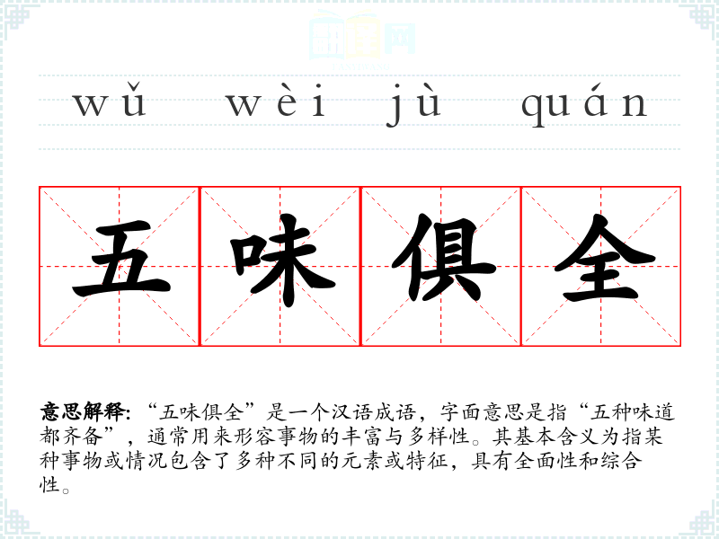 “五味俱全”是一个汉语成语,字面意思是指“五种味道都齐备”,通常用来形容事物的丰富与多样性。其基本含义为指某种事物或情况包含了多种不同的元素或特征,具有全面性和综合性。