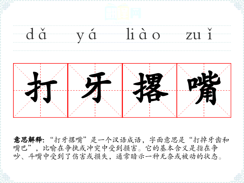 “打牙撂嘴”是一个汉语成语,字面意思是“打掉牙齿和嘴巴”,比喻在争执或冲突中受到损害。它的基本含义是指在争吵、斗嘴中受到了伤害或损失,通常暗示一种无奈或被动的状态。