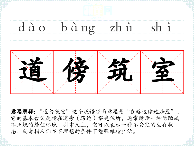 “道傍筑室”这个成语字面意思是“在路边建造房屋”。它的基本含义是指在道旁(路边)搭建住所,通常暗示一种简陋或不正规的居住环境。引申义上,它可以表示一种不安定的生存状态,或者指人们在不理想的条件下勉强维持生活。