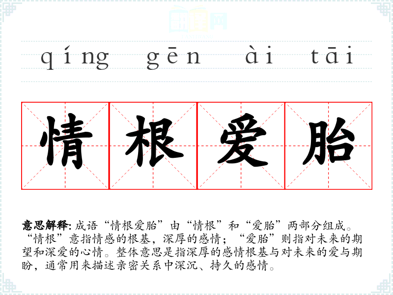 在英语中,可以用“deep affection”或“bond of love”来表达类似的情感,但并没有一个完全对应的成语来涵盖“情根爱胎”所包含的深厚感情与对未来的期待。这显示了文化之间在情感表达上的细微差别。