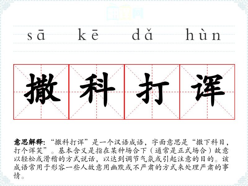 “撒科打诨”是一个汉语成语,字面意思是“撒下科目,打个诨笑”。基本含义是指在某种场合下(通常是正式场合)故意以轻松或滑稽的方式说话,以达到调节气氛或引起注意的目的。该成语常用于形容一些人故意用幽默或不严肃的方式来处理严肃的事情。