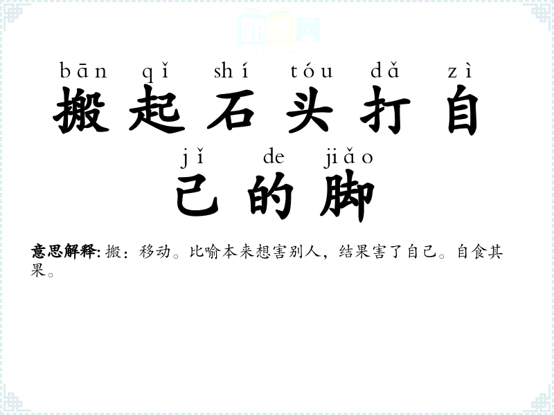 搬:移动。比喻本来想害别人,结果害了自己。自食其果。 |