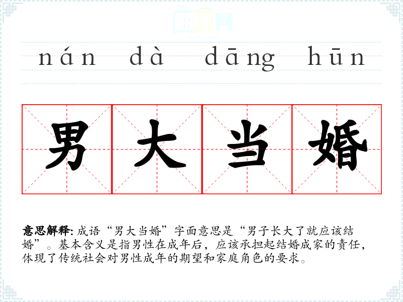 成语“男大当婚”字面意思是“男子长大了就应该结婚”。基本含义是指男性在成年后,应该承担起结婚成家的责任,体现了传统社会对男性成年的期望和家庭角色的要求。