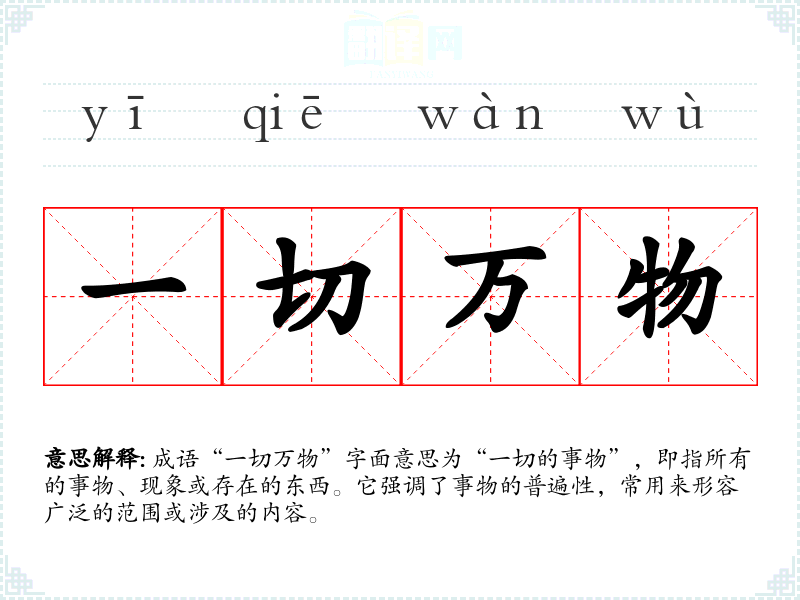 成语“一切万物”字面意思为“一切的事物”,即指所有的事物、现象或存在的东西。它强调了事物的普遍性,常用来形容广泛的范围或涉及的内容。
