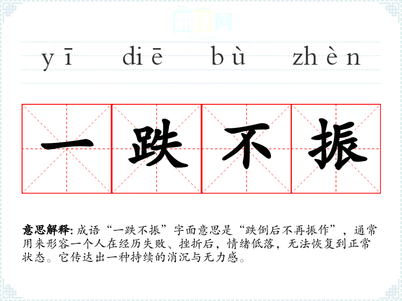 “一跌不振”并没有明确的历史典故或文学出处,但其构成的词汇中,“跌”意为摔倒,“不振”则表示无法振作,反映了人在遭遇困境后所表现出的消极状态。该成语的用法最早可能出现在民间口语中,后来逐渐被纳入书面语。它所体现的情感与状态具有普遍性,因而被广泛接受。