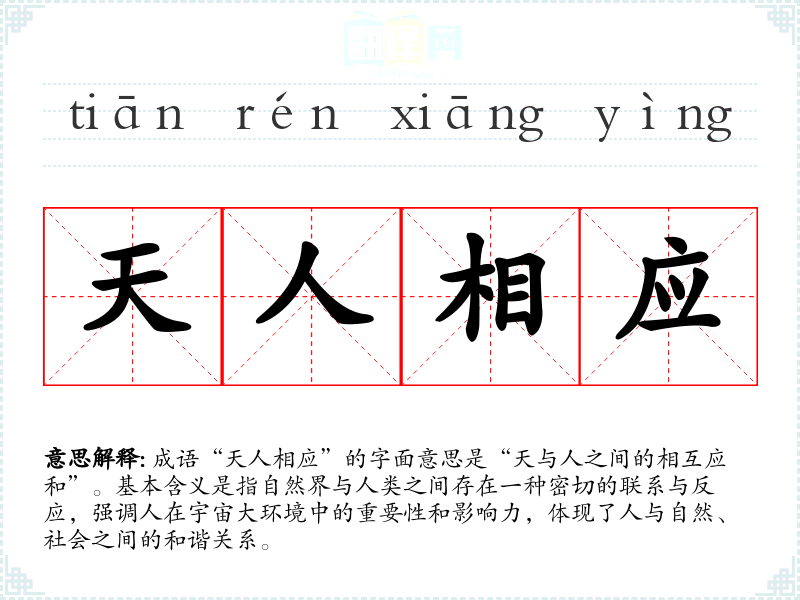 成语“天人相应”的字面意思是“天与人之间的相互应和”。基本含义是指自然界与人类之间存在一种密切的联系与反应,强调人在宇宙大环境中的重要性和影响力,体现了人与自然、社会之间的和谐关系。