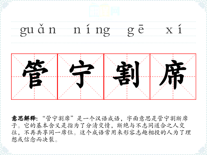 “管宁割席”是一个汉语成语,字面意思是管宁割断席子。它的基本含义是指为了分清交情,断绝与不志同道合之人交往,不再共享同一席位。这个成语常用来形容志趣相投的人为了理想或信念而决裂。
