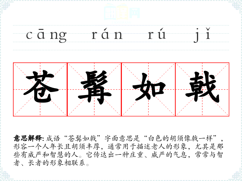 成语“苍髯如戟”字面意思是“白色的胡须像戟一样”,形容一个人年长且胡须丰厚,通常用于描述老人的形象,尤其是那些有威严和智慧的人。它传达出一种庄重、威严的气息,常常与智者、**的形象相联系。