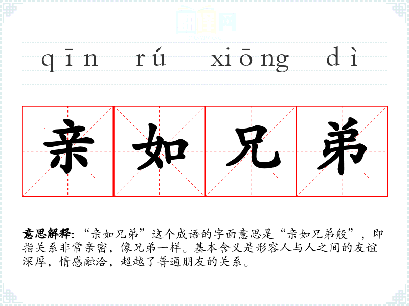 “亲如兄弟”这个成语的字面意思是“亲如兄弟般”,即指关系非常亲密,像兄弟一样。基本含义是形容人与人之间的友谊深厚,情感融洽,超越了普通朋友的关系。