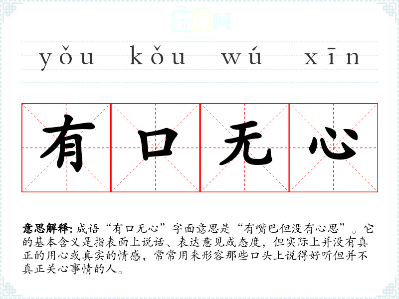 成语“有口无心”字面意思是“有嘴巴但没有心思”。它的基本含义是指表面上说话、表达意见或态度,但实际上并没有真正的用心或真实的情感,常常用来形容那些口头上说得好听但并不真正关心事情的人。