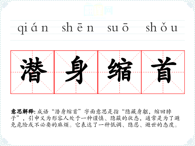 成语“潜身缩首”字面意思是指“隐藏身躯,缩回脖子”,引申义为形容人处于一种谨慎、隐蔽的状态,通常是为了避免危险或不必要的麻烦。它表达了一种低调、隐忍、避世的态度。