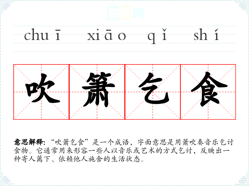 “吹箫乞食”是一个成语,字面意思是用箫吹奏音乐乞讨食物。它通常用来形容一些人以音乐或艺术的方式乞讨,反映出一种寄人篱下、依赖他人施舍的生活状态。