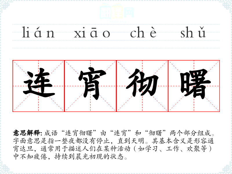 成语“连宵彻曙”由“连宵”和“彻曙”两个部分组成。字面意思是指一整夜都没有停止,直到天明。其基本含义是形容通宵达旦,通常用于描述人们在某种活动(如学*、工作、欢聚等)中不知疲倦,持续到晨光初现的状态。