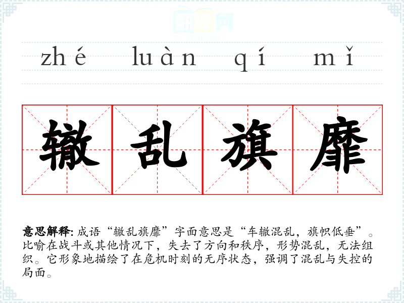 在**传统文化中,战争和军事指挥始终是重要的主题。在古代,军队的纪律和指挥对胜负至关重要,因此“辙乱旗靡”不仅反映了战争中的混乱局面,也暗示了在任何组织和活动中,秩序和指挥的重要性。在现代社会,虽然环境变化,但这一成语依然适用于形容复杂的社会现象,如经济危机、政治动荡等。