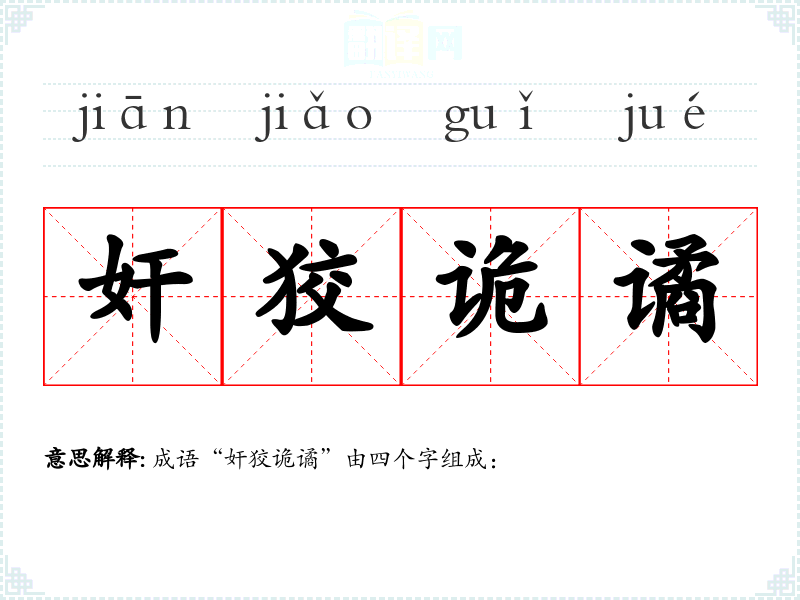 该成语的具体历史来源并不明确,但可以从字面上理解其构成。古代文献中常出现“奸”和“狡”这些词汇,表明社会对奸诈行为的警惕与批评。不同的文学作品中,常常描绘那些使用阴险手段的人物,使得这一成语在文化中逐渐形成。
