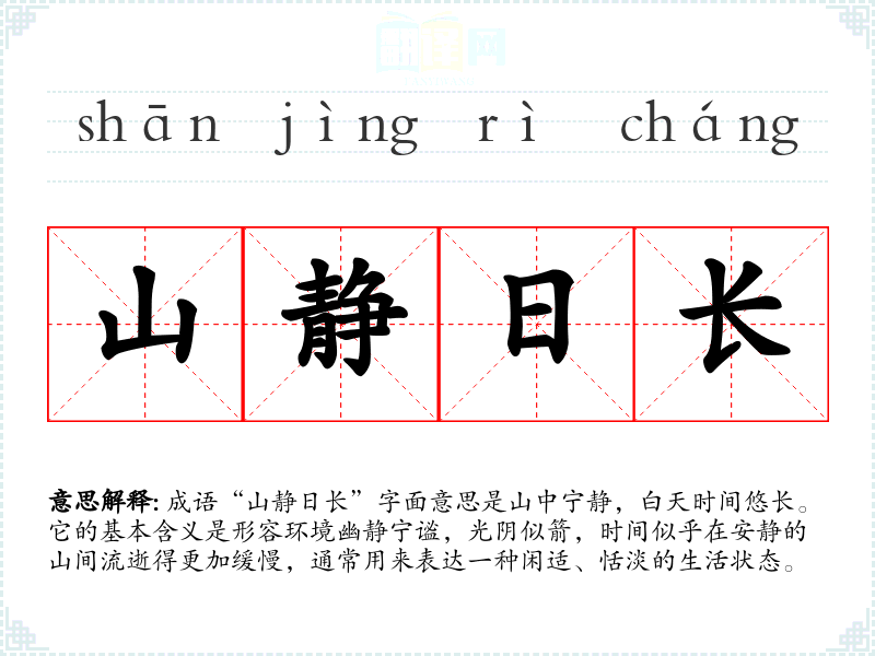 - 安宁静谧:强调内心和环境的宁静,与“山静日长”相似。