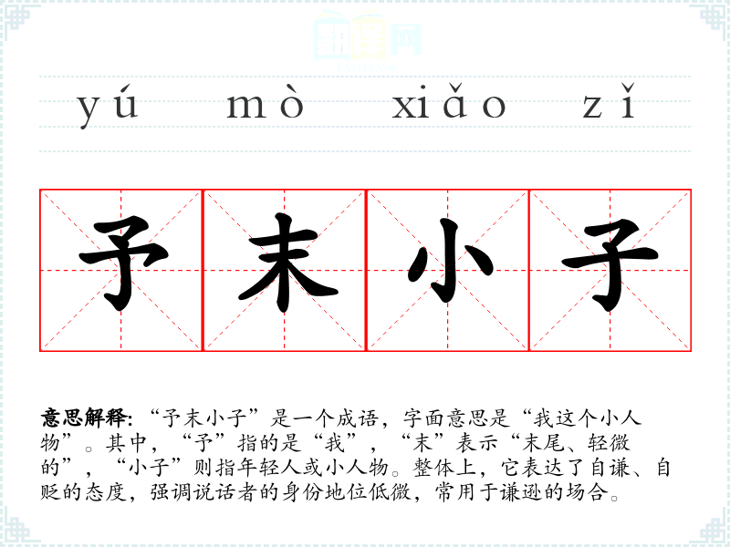 “予末小子”是一个成语,字面意思是“我这个小人物”。其中,“予”指的是“我”,“末”表示“末尾、轻微的”,“小子”则指年轻人或小人物。整体上,它表达了自谦、自贬的态度,强调说话者的身份地位低微,常用于谦逊的场合。