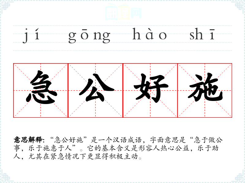 “急公好施”是一个汉语成语,字面意思是“急于做公事,乐于施惠于人”。它的基本含义是形容人热心公益,乐于助人,尤其在紧急情况下更显得积极主动。
