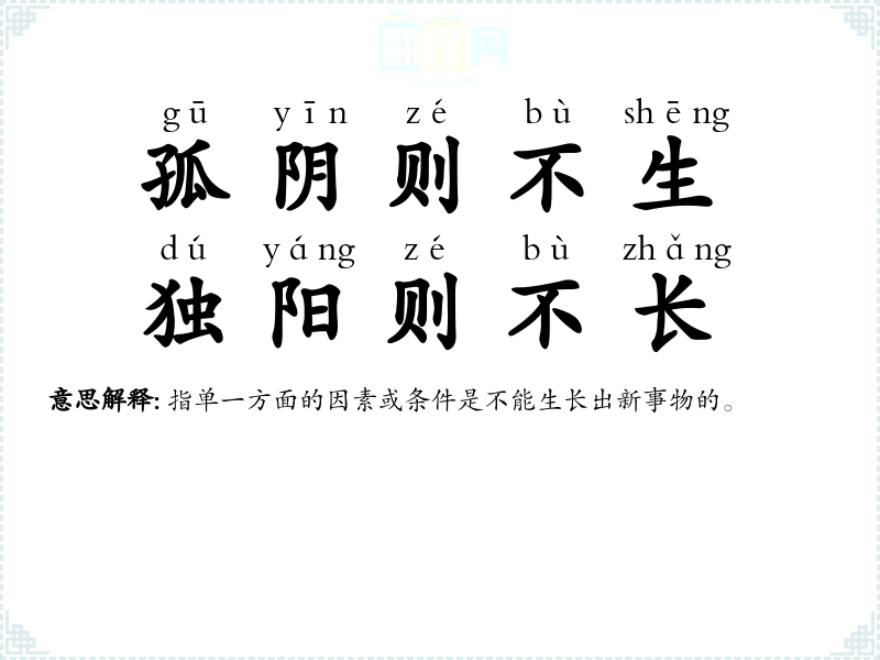 阴、阳:指事物矛盾的两个对立面;道:事物发展的规律。既有阴,又有阳,这就是道,即事物发展的规律。 |