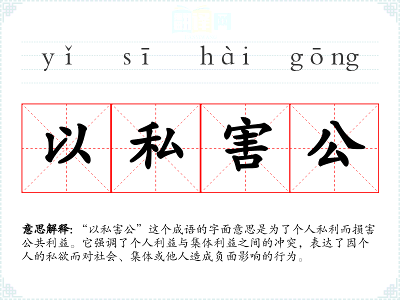 “以私害公”并没有明确的历史典故,但其表达的思想在**传统文化中有很深的根基。儒家强调公与私的关系,认为个人的行为应以社会的利益为重。因此,这个成语可以看作是对这种思想的具体反映,警示人们要避免为了个人利益而损害公共利益的行为。