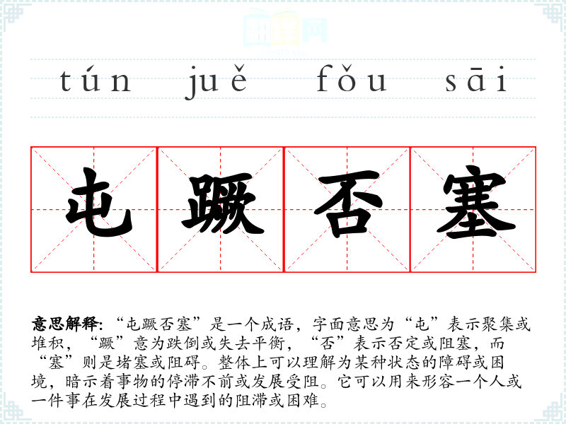 “屯蹶否塞”出自《周易》,其中“屯”是《周易》六十四卦之一,代表积聚、困境的开始;“蹶”则可以理解为意外的跌倒;“否”代表否定、阻隔;“塞”则为堵塞。在《周易》中,这些词汇被用来描述事物的发展状态,以及在面对困境时的应对策略。