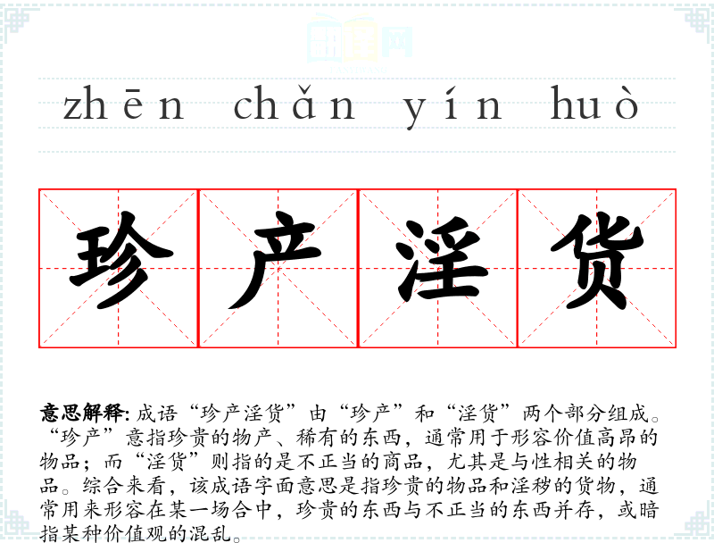 成语“珍产淫货”由“珍产”和“淫货”两个部分组成。“珍产”意指珍贵的物产、稀有的东西,通常用于形容价值高昂的物品;而“淫货”则指的是不正当的商品,尤其是与性相关的物品。综合来看,该成语字面意思是指珍贵的物品和淫秽的货物,通常用来形容在某一场合中,珍贵的东西与不正当的东西并存,或暗指某种价值观的混乱。