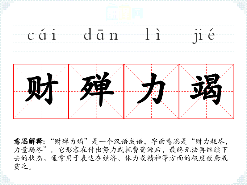 “财殚力竭”是一个汉语成语,字面意思是“财力耗尽,力量竭尽”。它形容在付出努力或耗费资源后,最终无法再继续下去的状态。通常用于表达在经济、体力或精神等方面的极度疲惫或贫乏。