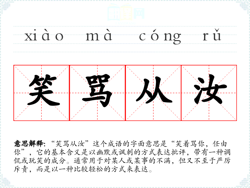 “笑骂从汝”这个成语的字面意思是“笑着骂你,任由你”,它的基本含义是以幽默或讽刺的方式表达批评,带有一种调侃或玩笑的成分。通常用于对某人或某事的不满,但又不至于严厉斥责,而是以一种比较轻松的方式来表达。