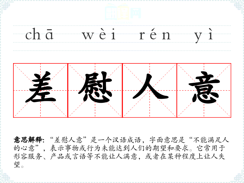 “差慰人意”是一个汉语成语,字面意思是“不能满足人的心意”,表示事物或行为未能达到人们的期望和要求。它常用于形容服务、产品或言语等不能让人满意,或者在某种程度上让人失望。