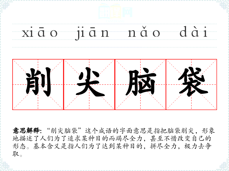 “削尖脑袋”这个成语的字面意思是指把脑袋削尖,形象地描述了人们为了追求某种目的而竭尽全力,甚至不惜改变自己的形态。基本含义是指人们为了达到某种目的,拼尽全力,极力去争取。