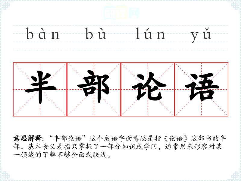 “半部论语”这个成语字面意思是指《论语》这部书的半部,基本含义是指只掌握了一部分知识或学问,通常用来形容对某一领域的了解不够全面或肤浅。