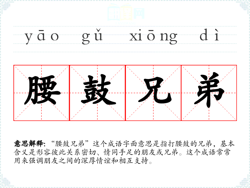“腰鼓兄弟”这个成语字面意思是指打腰鼓的兄弟,基本含义是形容彼此关系密切、情同手足的朋友或兄弟。这个成语常常用来强调朋友之间的深厚情谊和相互支持。