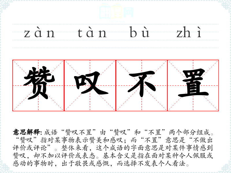 成语“赞叹不置”由“赞叹”和“不置”两个部分组成。“赞叹”指对某事物表示赞美和感叹;而“不置”意思是“不做出评价或评论”。整体来看,这个成语的字面意思是对某件事情感到赞叹,却不加以评价或表态。基本含义是指在面对某种令人佩服或感动的事物时,出于敬畏或感慨,而选择不发表个人看法。