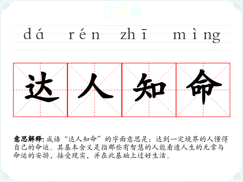 成语“达人知命”的字面意思是:达到一定境界的人懂得自己的命运。其基本含义是指那些有智慧的人能看透人生的无常与命运的安排,接受现实,并在此基础上过好生活。
