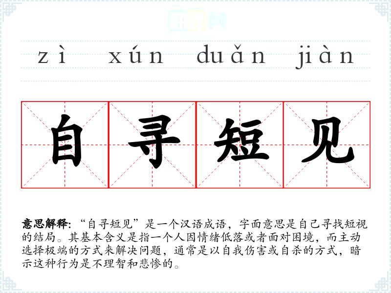 “自寻短见”是一个汉语成语,字面意思是自己寻找短视的结局。其基本含义是指一个人因情绪低落或者面对困境,而主动选择极端的方式来解决问题,通常是以自我伤害或自杀的方式,暗示这种行为是不理智和悲惨的。
